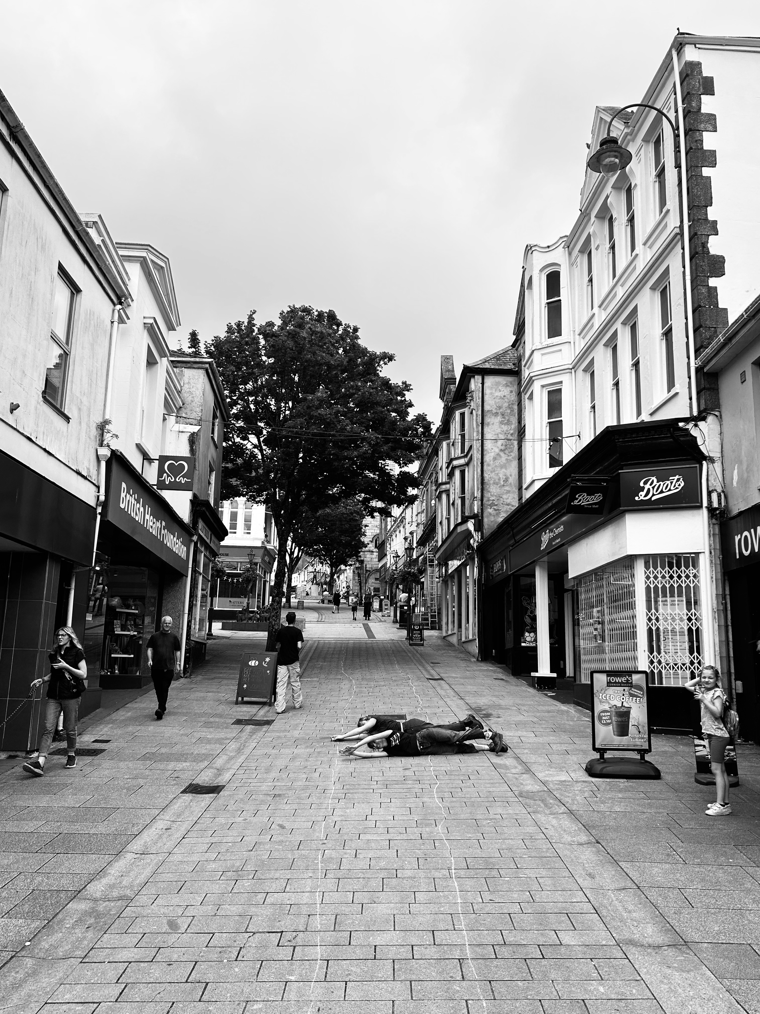 Millie and I were interested in disrupting the act of walking - a pattern which dominates the high street. So instead we crawled, rolled and wrestled. Oh, and a couple of plinths grew legs and escaped from the gallery too.